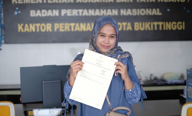 Bukittinggi – Penerapan Sertipikat Elektronik memberikan rasa aman dan ketenangan bagi masyarakat, khususnya di tengah musim penghujan yang rawan terjadi bencana. Hal tersebut dirasakan langsung oleh pemohon layanan pertanahan di Kota Bukittinggi yang kini tidak lagi khawatir terhadap risiko kerusakan atau kehilangan dokumen fisik sertipikat tanahnya.
